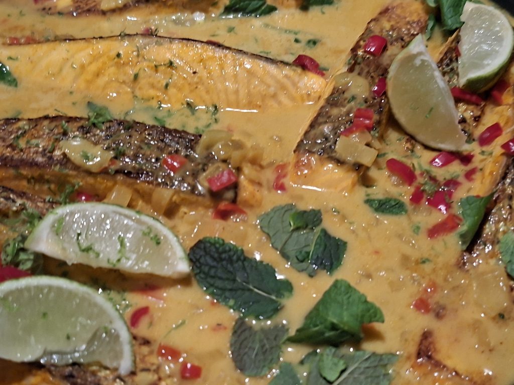 - Laxinn er settur í skál með lime safa, túrmerik og salti. Steikið fiskinn með roðhliðina niður í um 3 mínútur. Setjið sinnepsfræin á pönnuna, snúið fiskinum og steikið í 2 mínútur. Hellið heitri karrýsósunni yfir og látið malla í 2-3 mínútur.