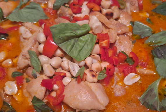 - Setjið karrýsósuna í skál og stráið yfir hnetum, chili og basil.