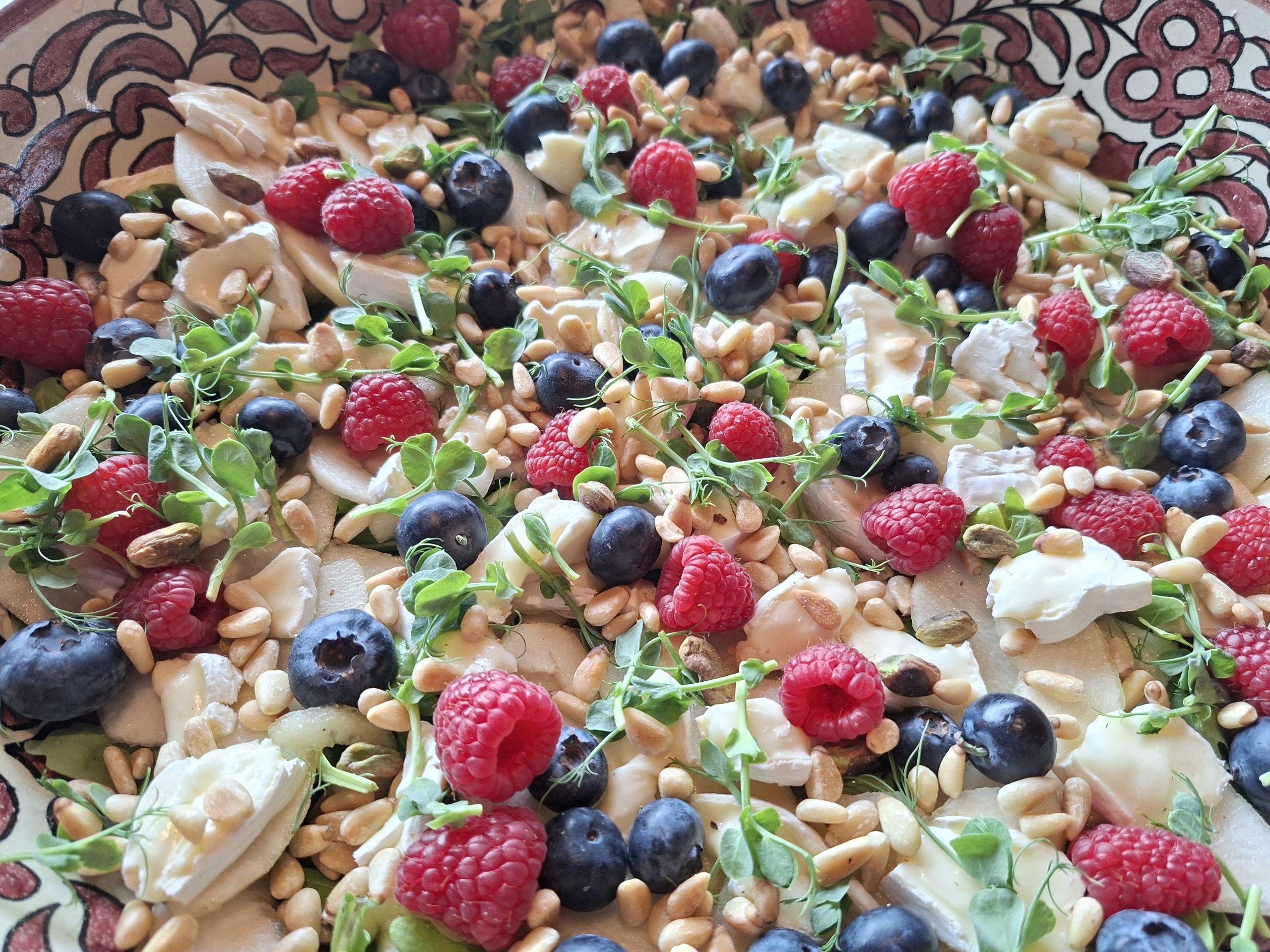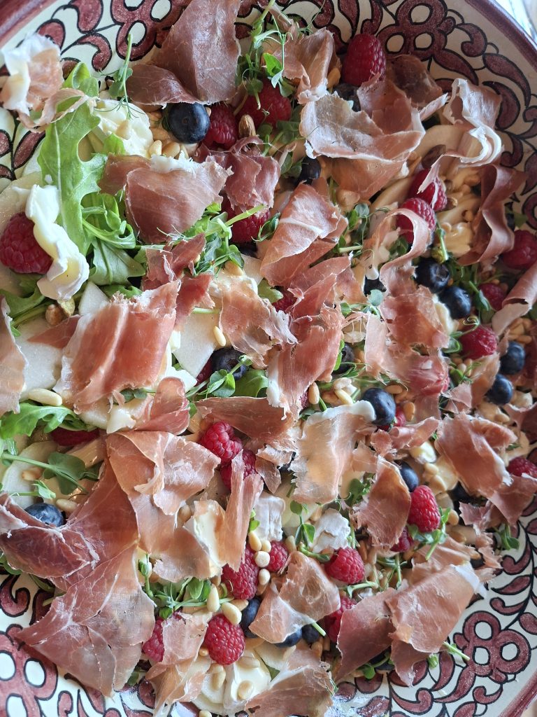 Ferskt salat með parmaskinku, perum og brómberjum birtist á matarvef Morgunblaðsins og ég varð að prófa. Aðlagaði það að því sem ég átti í skápunum og hafði skinkuna í stórum bitum svo fólk gæti valið. Aðalmyndin er án skinku en hér að neðan með 24 mánaða serrano skinku. Ég þvoði klettasalatið og setti örlítinn sítrónusafa yfir til að gefa bit og perurnar voru settar í lög með appelsínusafa og hunangi. Virkaði mjög vel í báðum tilfellum. Notaði bláber og hindber af því ég átti þau og bætti við örlitlu af pistasíum sem voru í skápnum. Baghette er nauðsynlegt á kantinn.